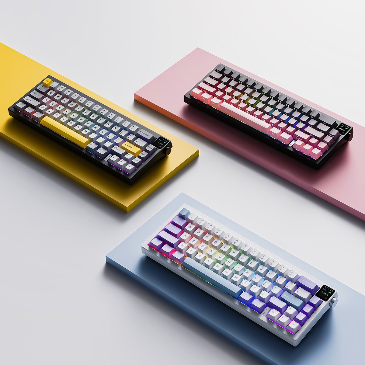 Equipped with a 0.85-inch interactive screen, the AK650 keyboard conveniently displays battery status, date, time, connection mode, operating system information, backlight options, and customizable GIF animations. Additionally, it features a side-mounted knob that not only saves valuable keyboard space but also adds a novel touch of a keyboard with a built-in screen.