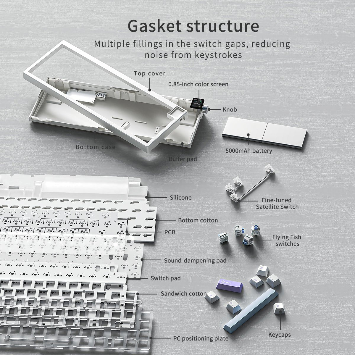 • Gasket-mount + multi-layer foam = cushioned, quiet typing