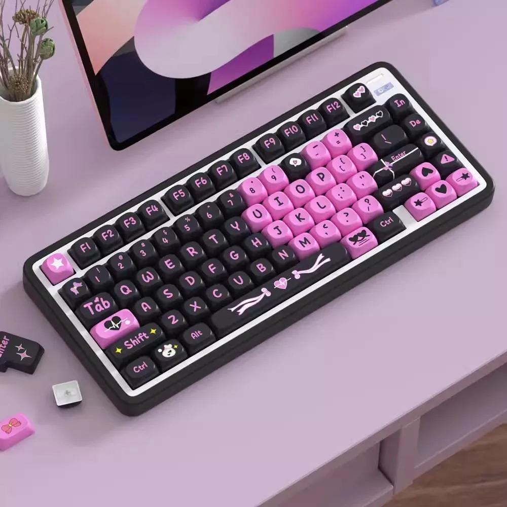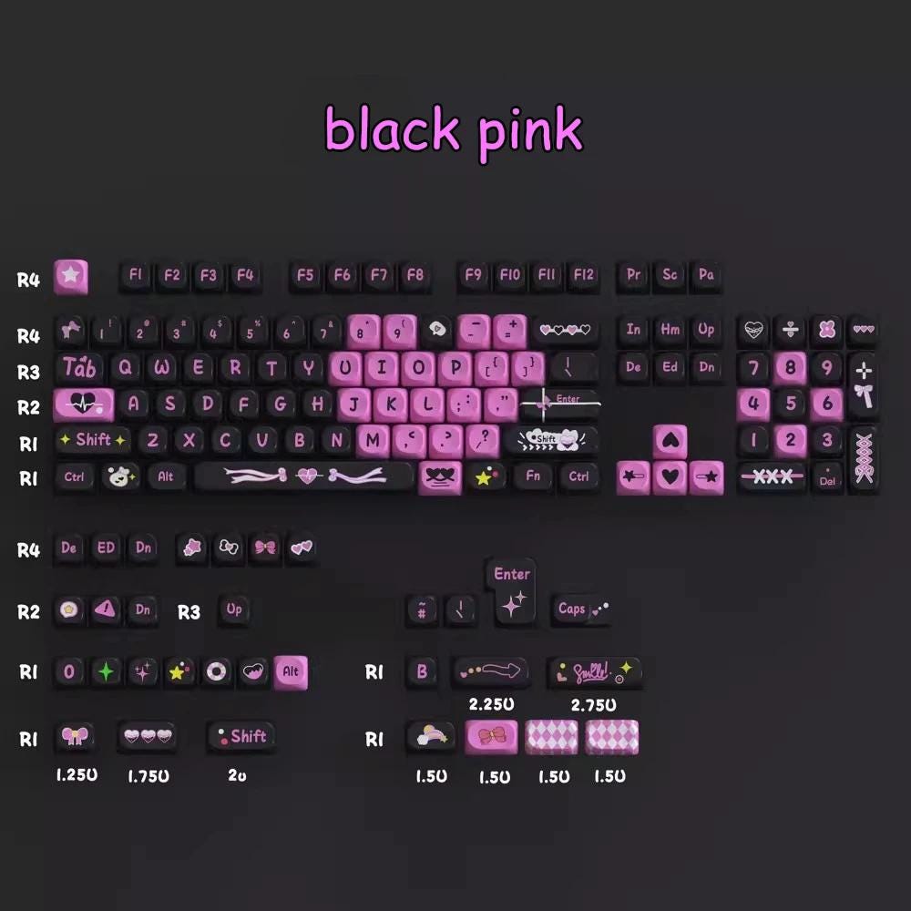 Add a stylish and playful twist to your mechanical keyboard with this Cute Black & Pink Keycap Set! Featuring a sleek black base accented with vibrant pink legends and icons, this set brings the perfect balance of boldness and cuteness to your desk setup.