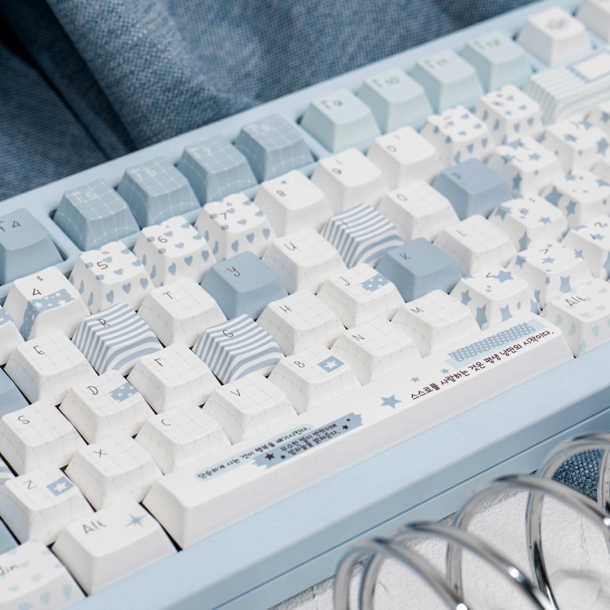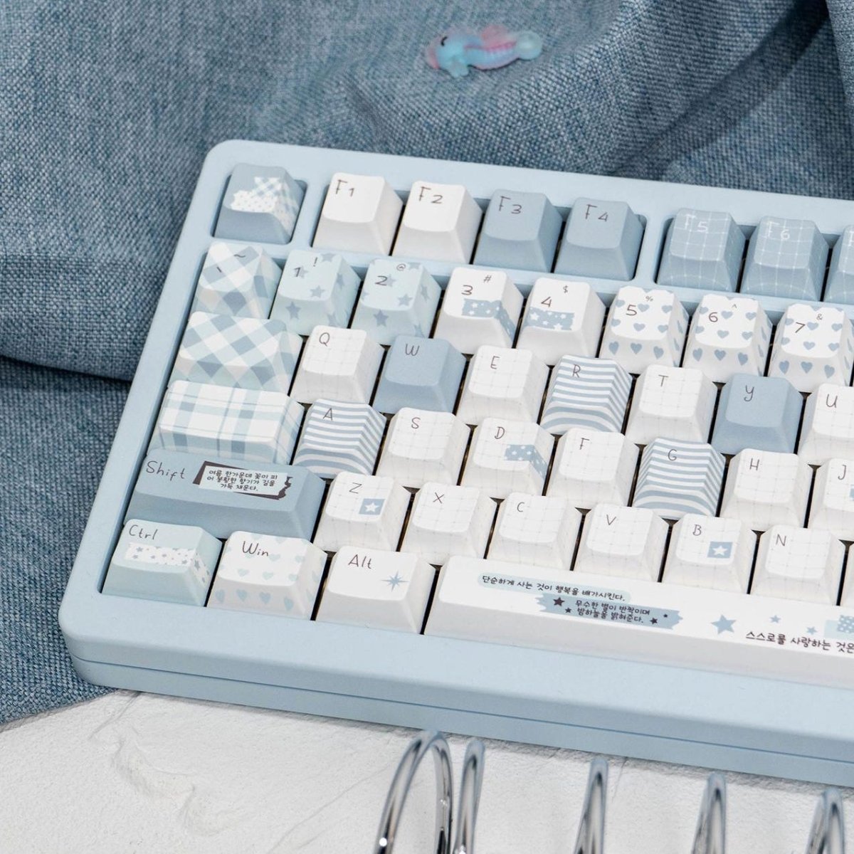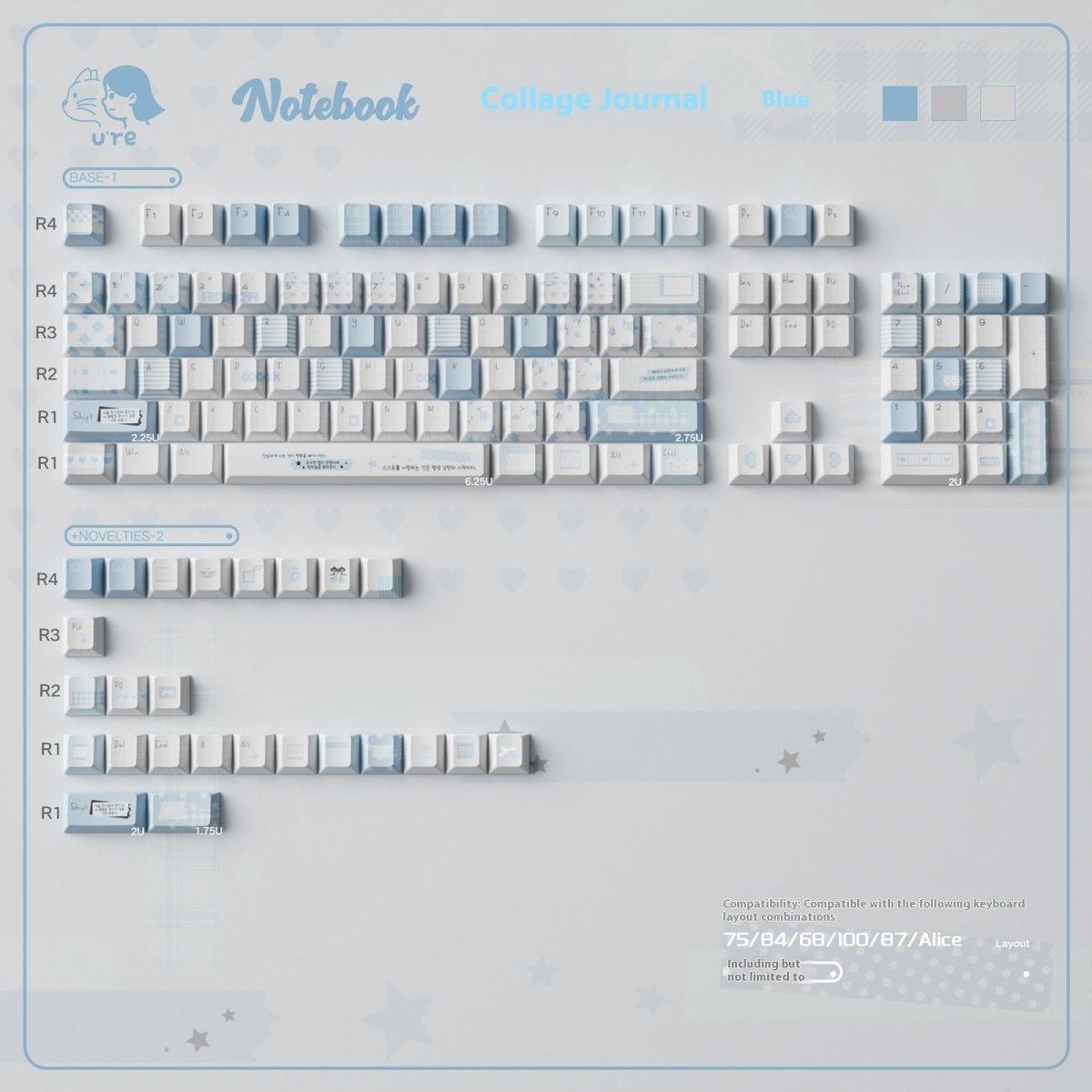 The Cute Blue Notebook Theme Artisan Keycaps Set blends soft blue tones with nostalgic stationery patterns — grids, stripes, stars, and tiny notes — just like the pages of your favorite school notebook. Its gentle pastel palette and clean design create a cozy, thoughtful typing space perfect for journaling, writing, or simply enjoying a minimalist setup.