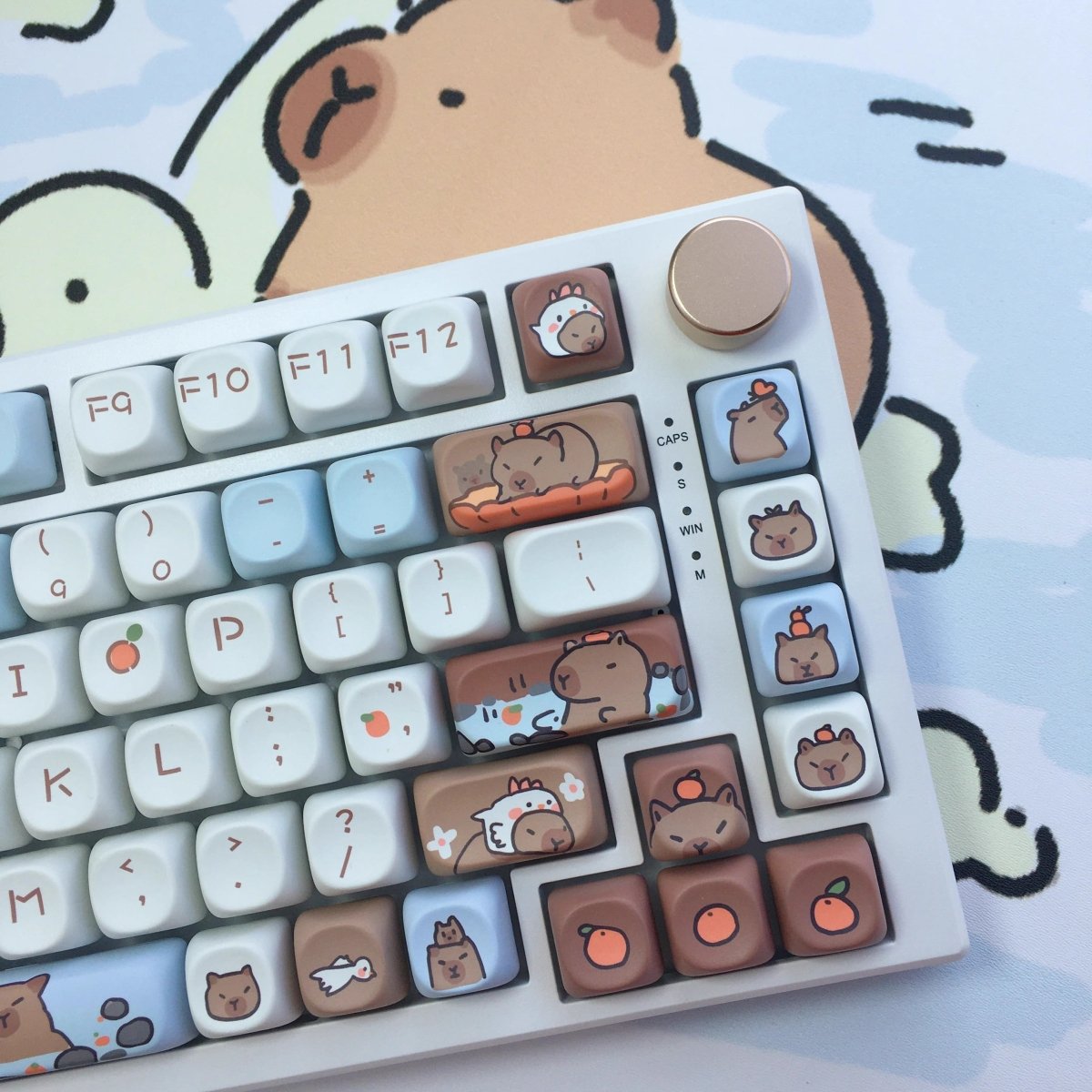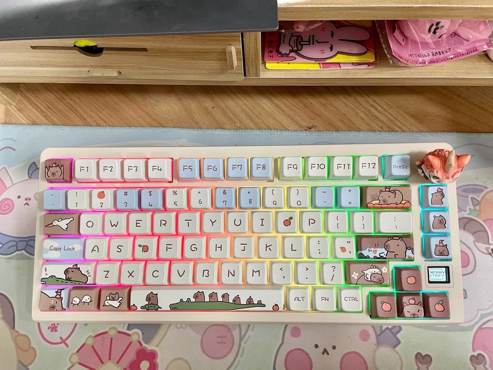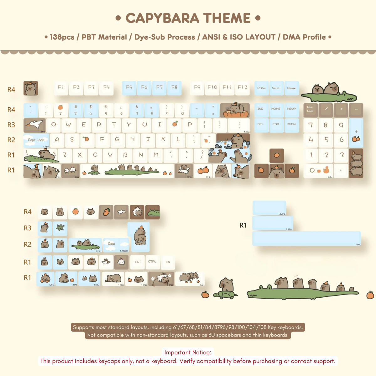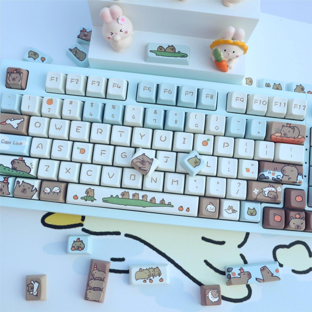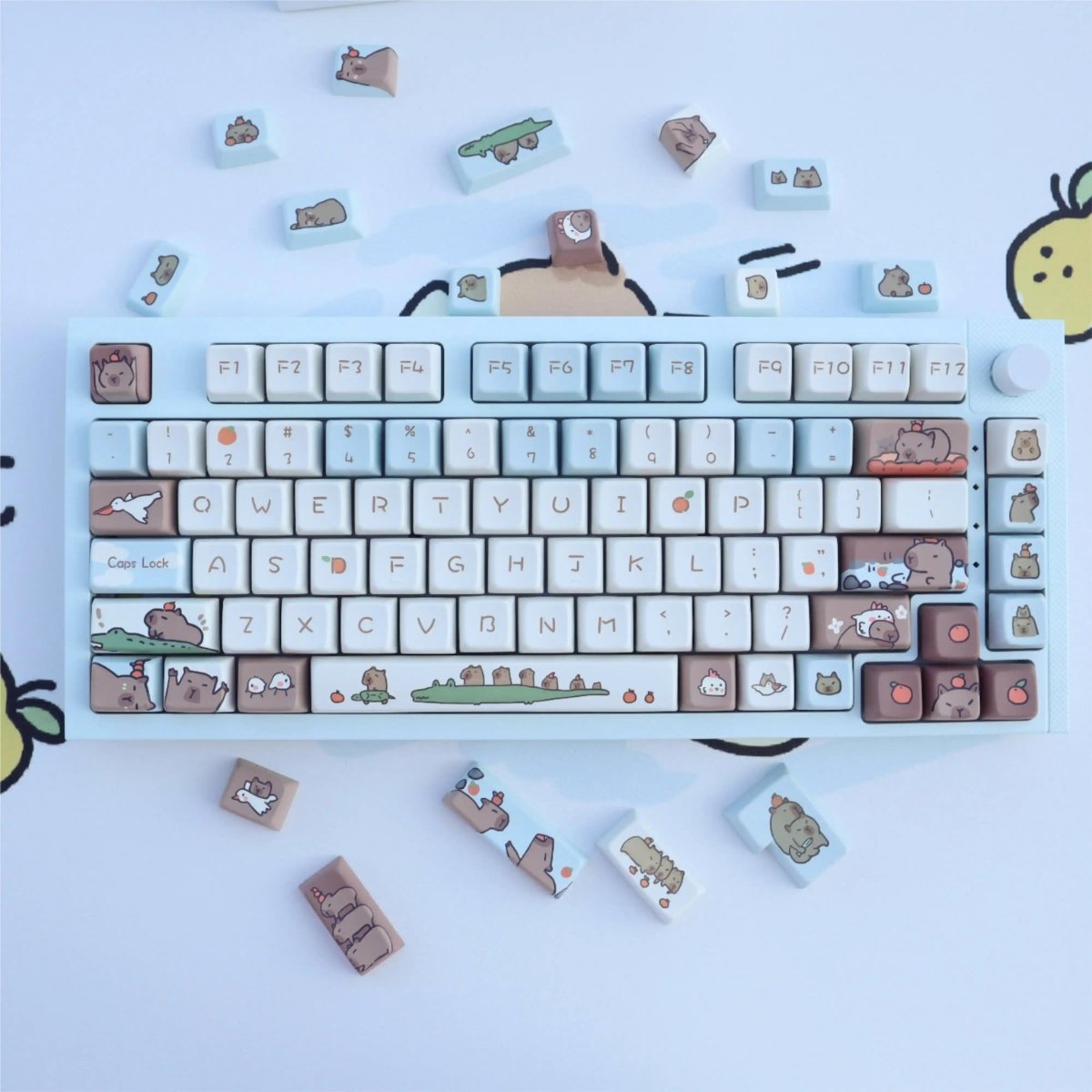 • Capybara-Themed Design: Each keycap features cute and playful illustrations inspired by the beloved capybara, making your keyboard truly unique and eye-catching. 🐹✨