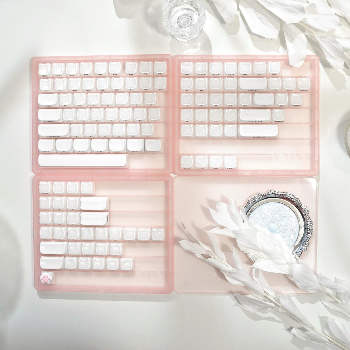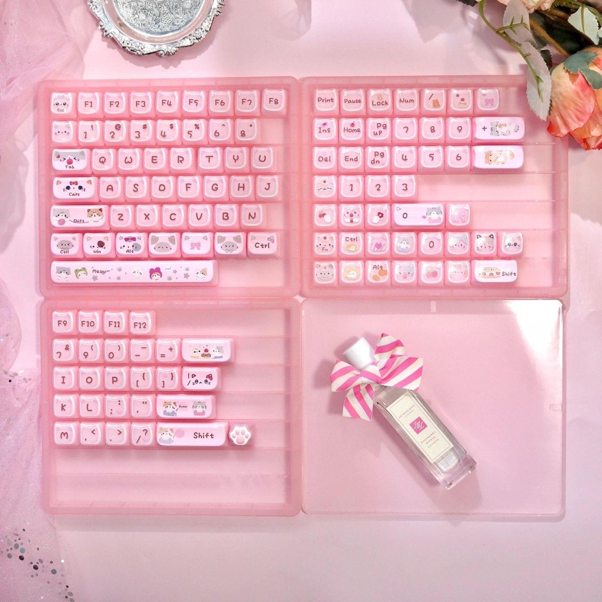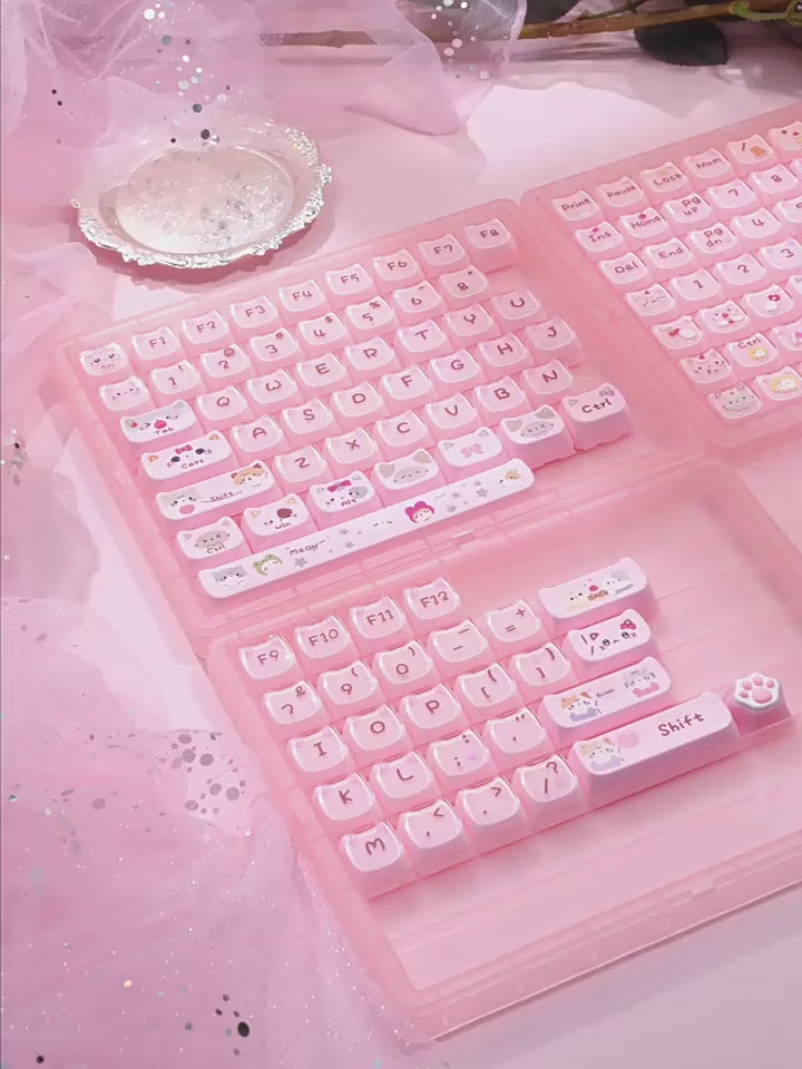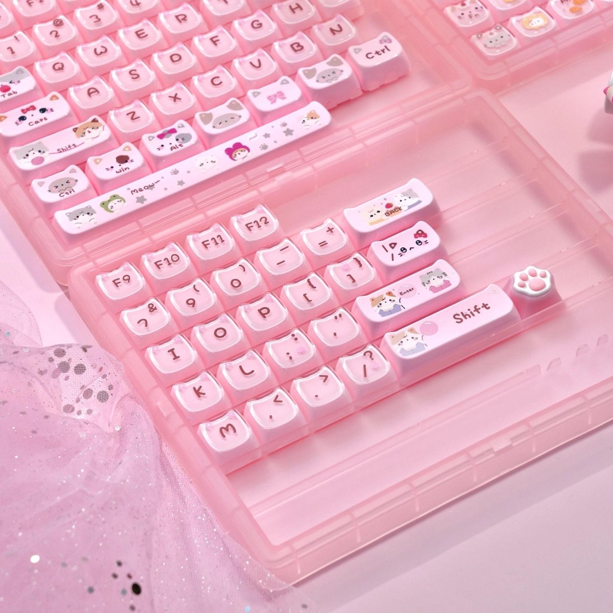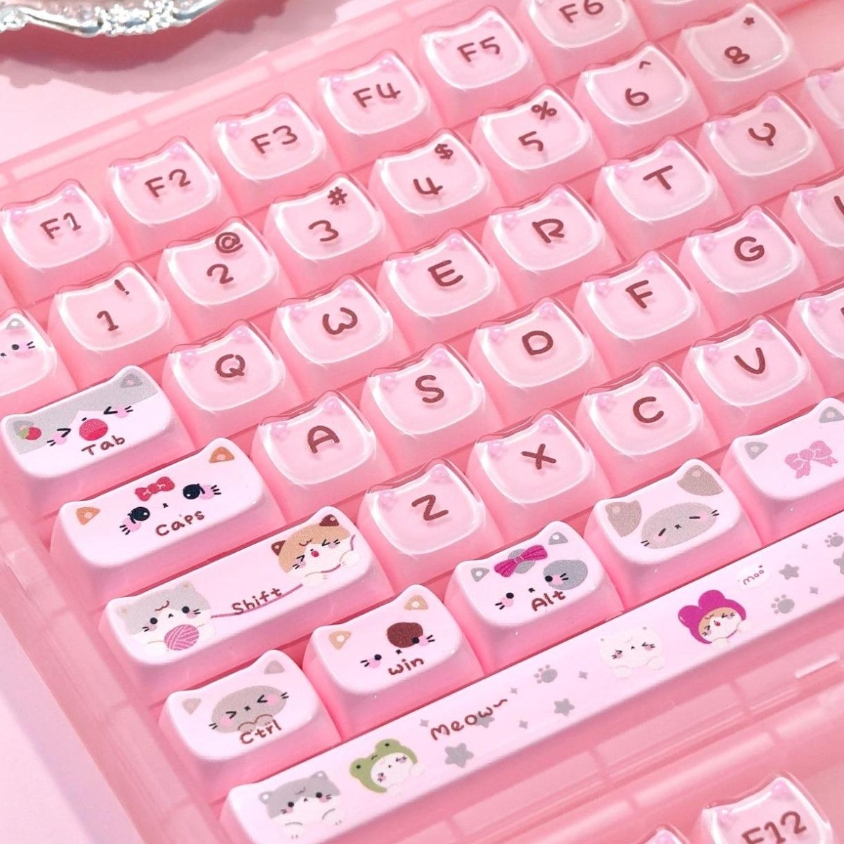Designed with charming cat faces, soft curves, and two-tone transparency, each keycap feels like a tiny collectible. The crystal-clear outer layer paired with pastel pink or clean white tones creates a glossy, candy-like finish that looks magical under any lighting—ideal for kawaii, pastel, and soft-core keyboard builds.