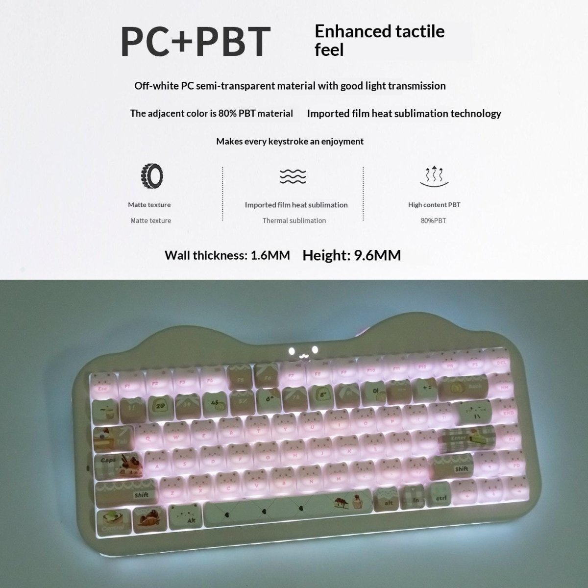 Crafted from a premium PBT + PC material blend (≈80% PBT) using high-quality dye-sublimation printing, these keycaps offer long-lasting clarity and durability. The smooth ceramic-like finish feels gentle on your fingertips, while the semi-transparent design softly diffuses RGB lighting for a warm, cozy glow.