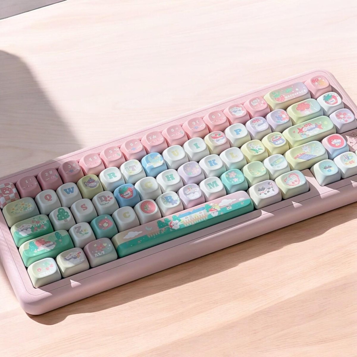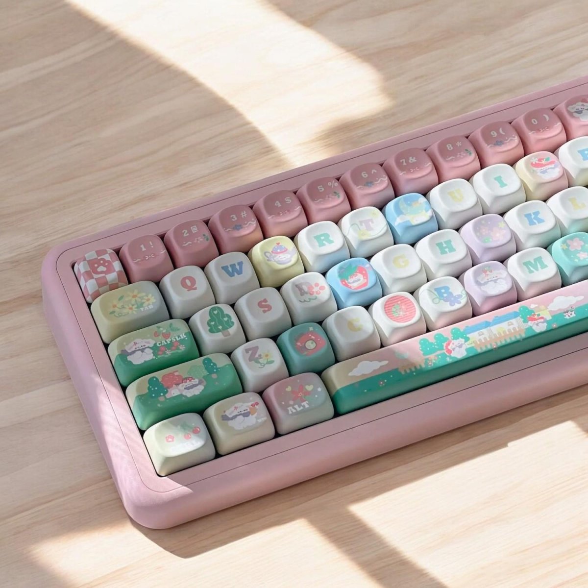 Sweet, dreamy, and full of storybook magic — like stepping into a pastel fairytale village where cozy cottages, clouds, and stars live right on your keyboard. Perfect for anyone who loves kawaii, cozy, and imaginative setups.
