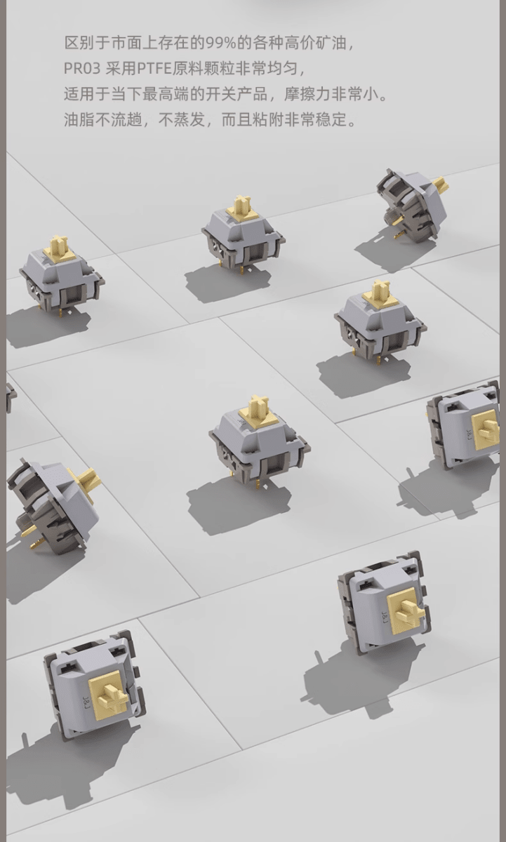 Each switch is factory-lubed with Japan-imported PTFE-based PR03 lubricant, ensuring long-lasting smoothness and stable sound performance. Designed for 3-pin MX-compatible hot-swap boards, it’s ideal for custom mechanical keyboard builds focused on silent operation and tactile control.