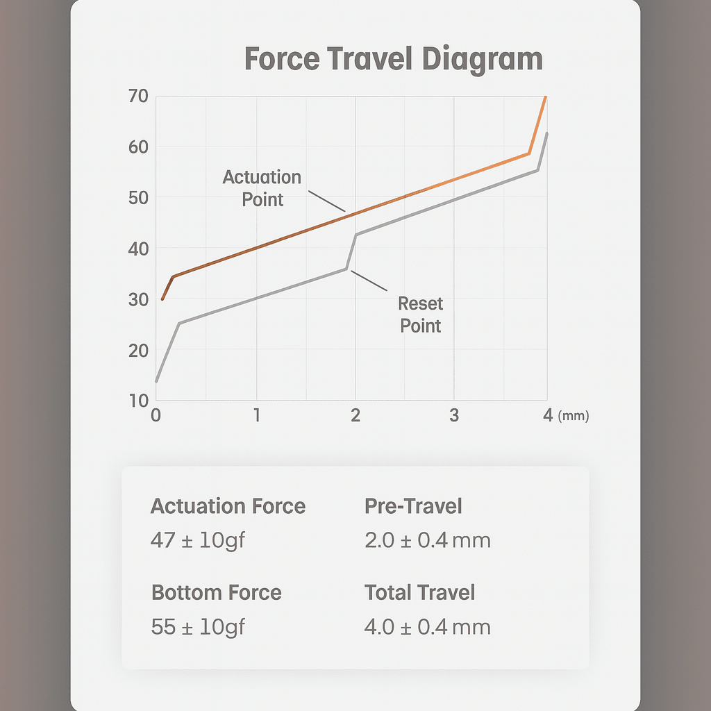 Built for those who prefer a soft touch and minimal sound, the switch features a 47g actuation force and a total travel of 4.0mm. Its 18mm extended spring provides responsive rebound and consistent feel, while the dual-color POM + silicone stem delivers a clean linear motion without scratchiness.