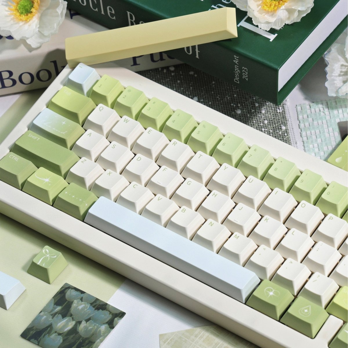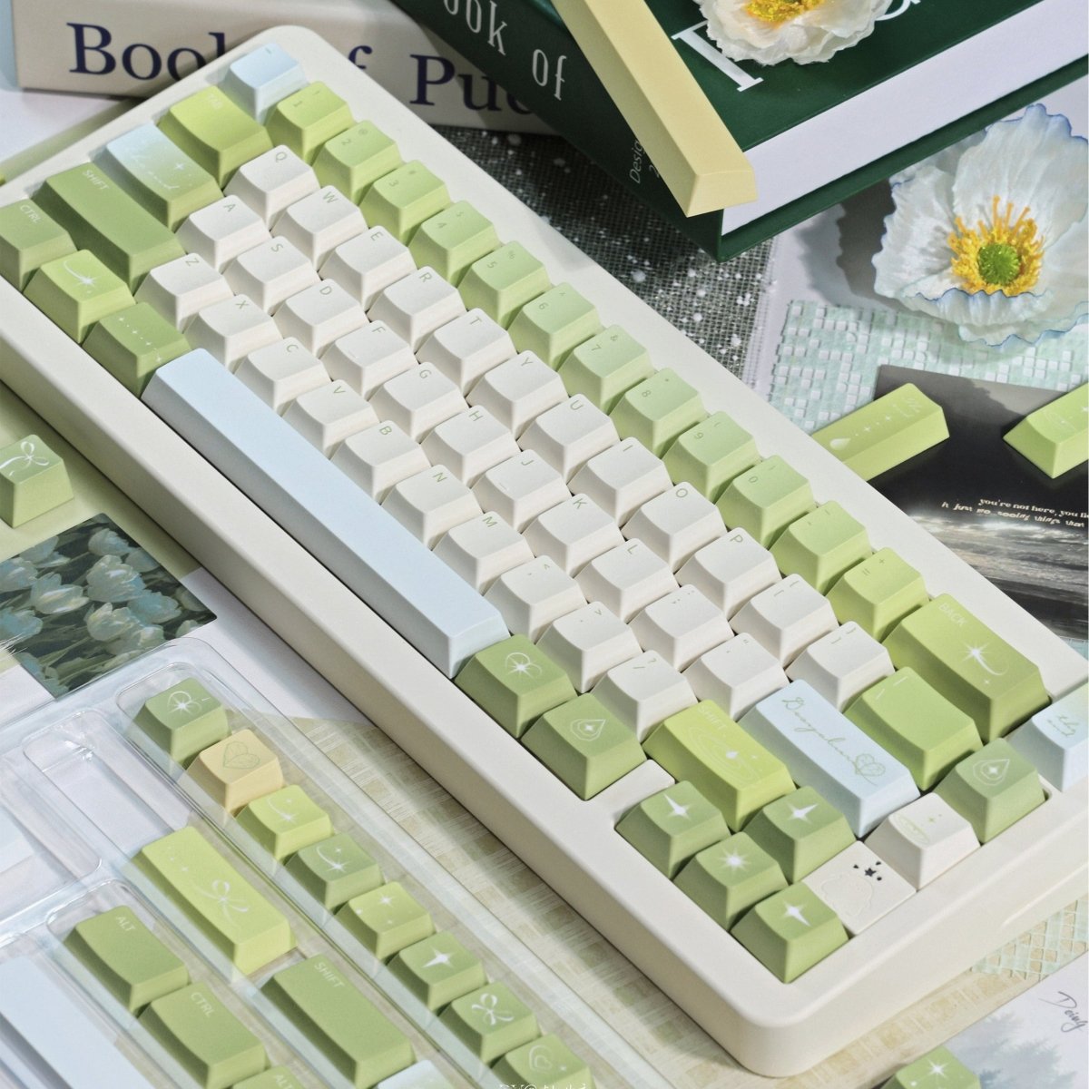 The Love Rain keycap set features a soothing green color palette, creating a refreshingly natural visual effect. Inspired by the raindrop elements of nature, each keycap appears to be gently kissed by a fine mist, exuding a subtle, damp essence. Paired with a white base color, the set evokes a serene and elegant ambiance, akin to a soft, misty atmosphere.