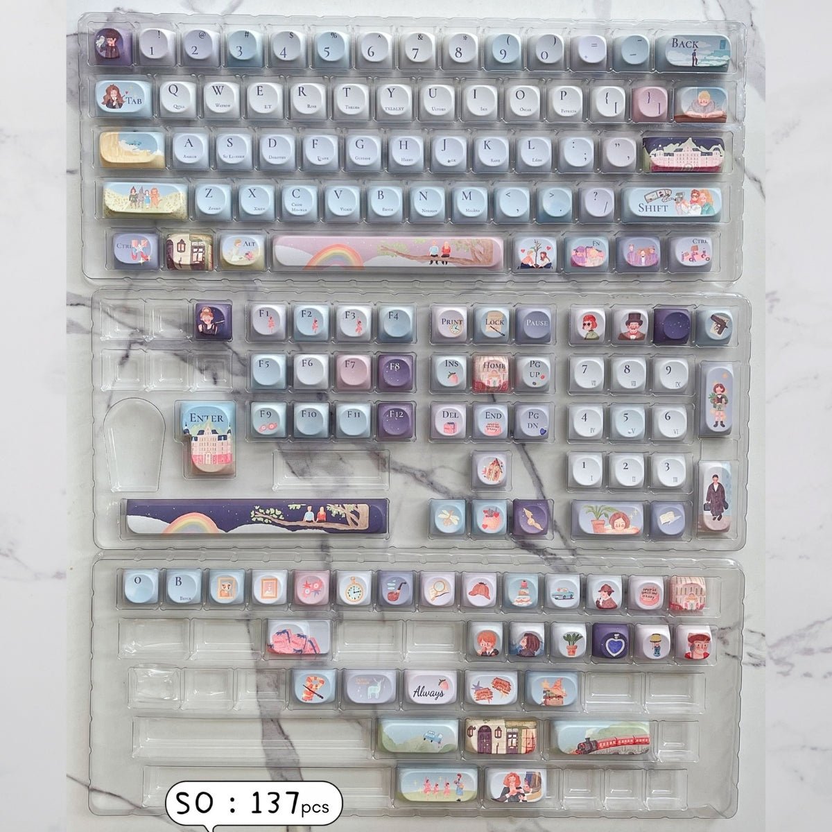 • SO Profile – 137 keys | Cherry Profile – 144pcs | (includes novelties + extra spacebars)