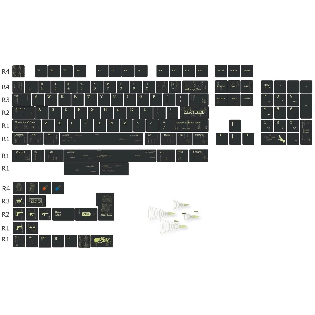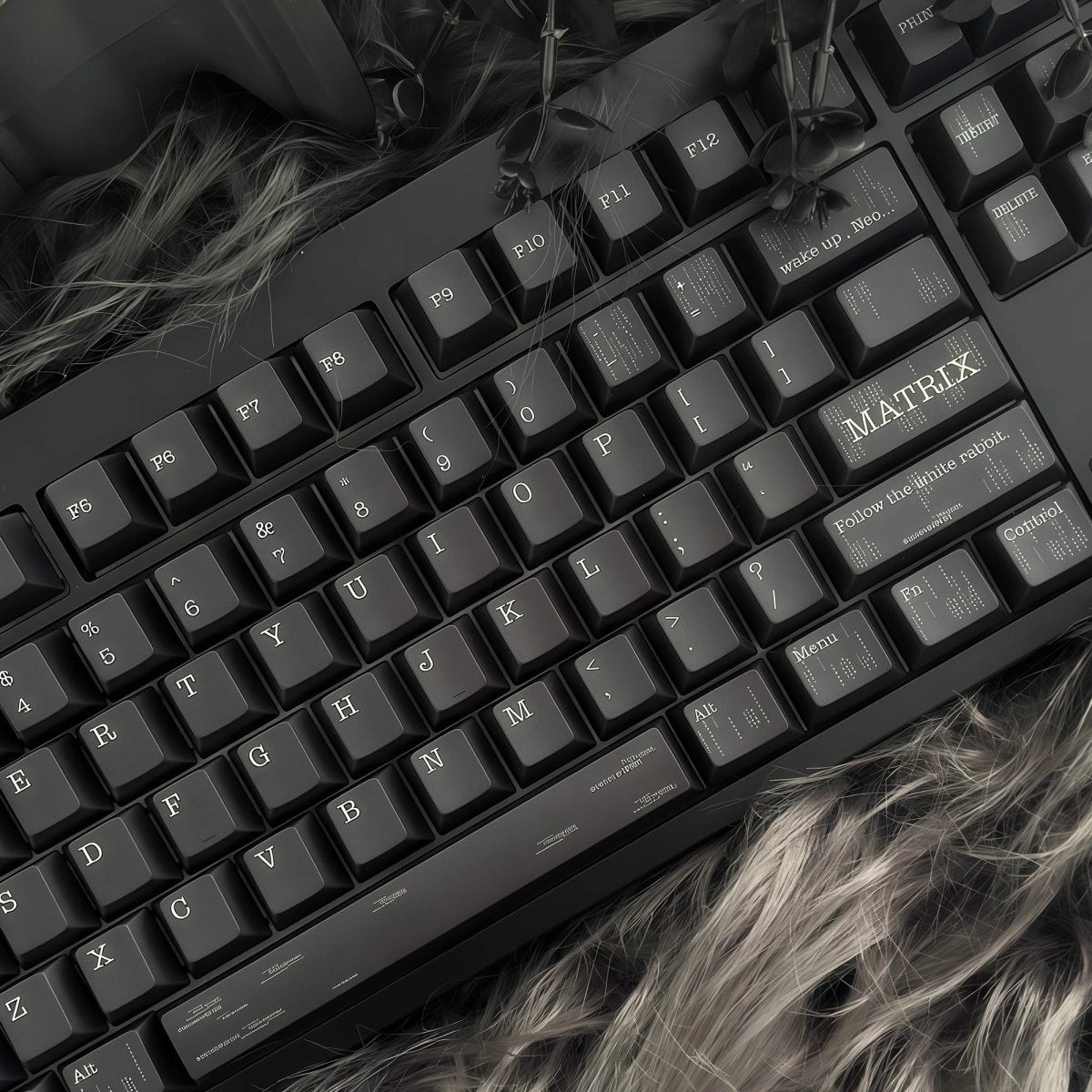 In the movie, protagonist Neo uncovers this harsh truth under the guidance of Morpheus and bravely decides to rebel against machine dominance. The black tones of the keycaps symbolize the profound darkness and unknown of the Matrix, while the word “MATRIX” serves as a constant reminder of this virtual existence. The unique symbols resemble the mysterious code Neo encounters while navigating the Matrix, representing the algorithms and rules that underpin this virtual world.