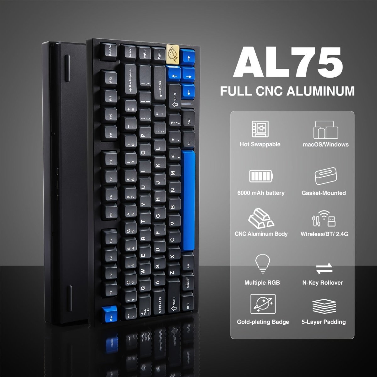 Gasket Mount Construction & Pre-Lubed Switches: The gasket-mounted design enhances typing comfort by reducing noise and vibrations. The pre-lubed switches provide a softer, cushioned feel and help eliminate harsh bottoming-out sensations, giving you a smoother typing experience. With 4 layers of sound-dampening fillings, the AL75 ensures quieter, more pleasing keystrokes—perfect for both work and play.